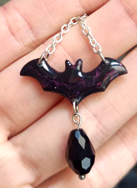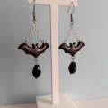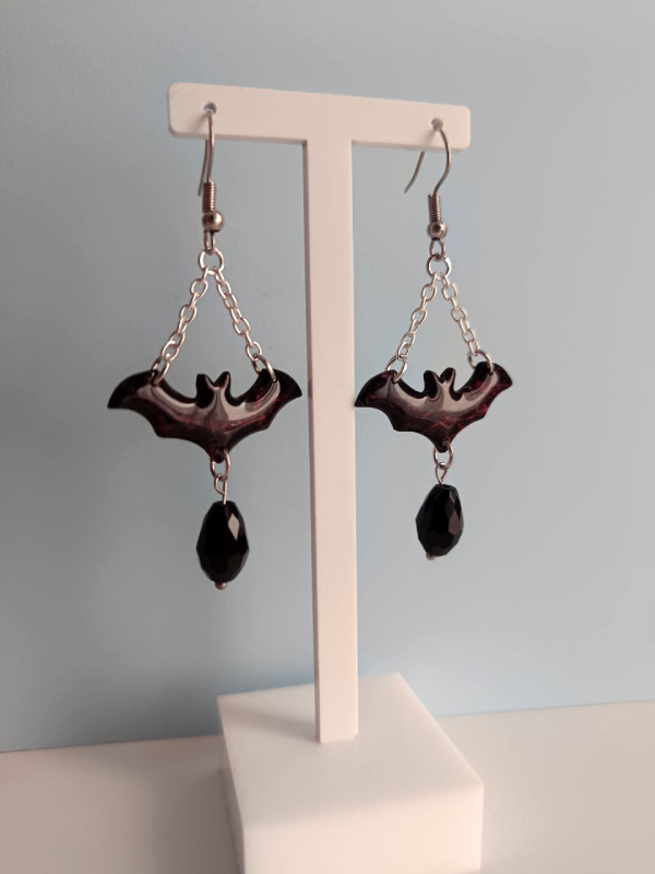 Fledermaus-Ohrringe in schwarz mit violettem Schimmer-Effekt, schwarzen geschliffenen Glasperlen und silbernen Elementen.