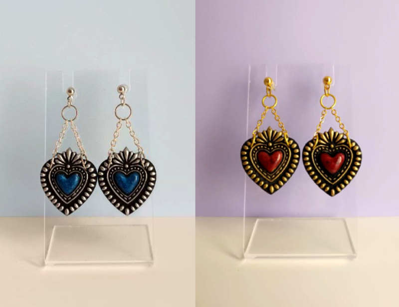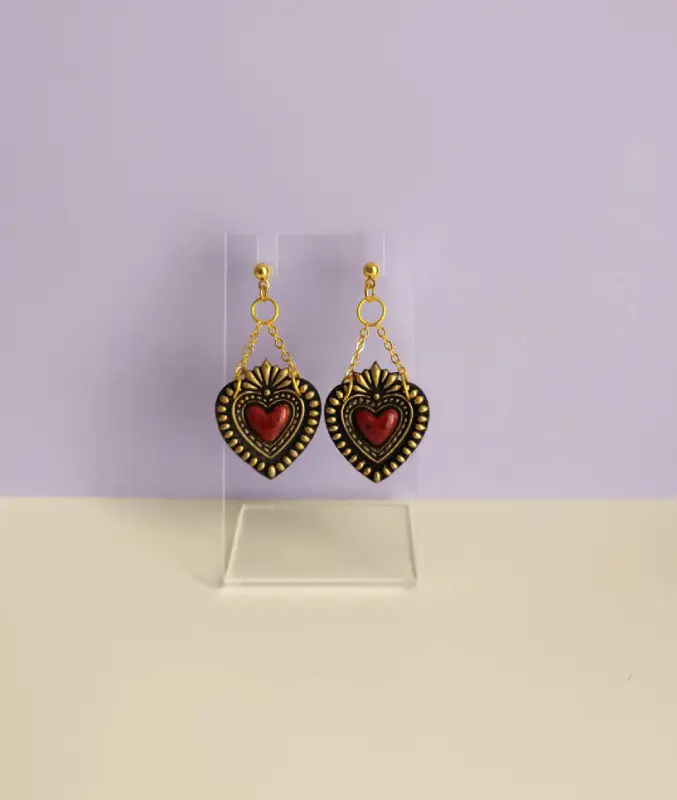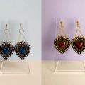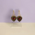 Schwarze Ohrringe in Vintage-Style mit goldenen Elementen und rotem Herz im Zentrum.