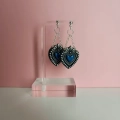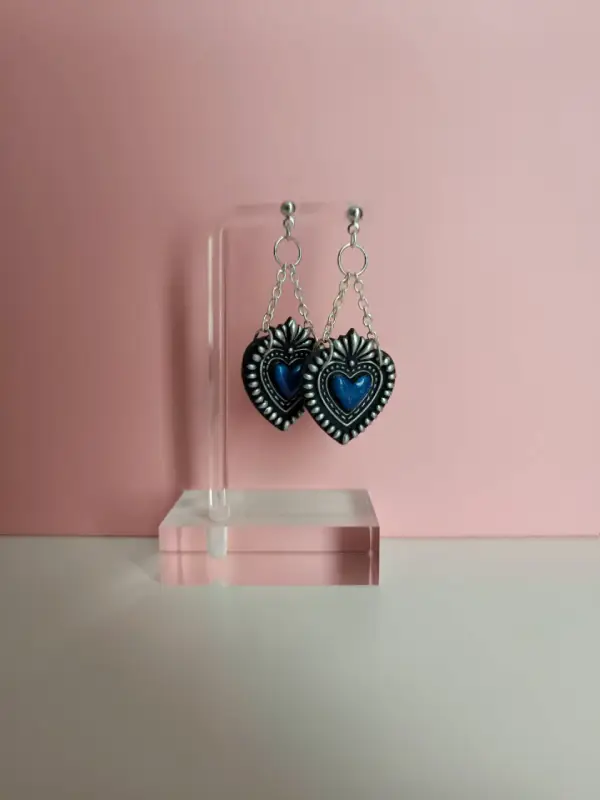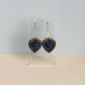 Schwarze Ohrringe in Vintage-Style mit silbernen Elementen und blauem Herz im Zentrum.